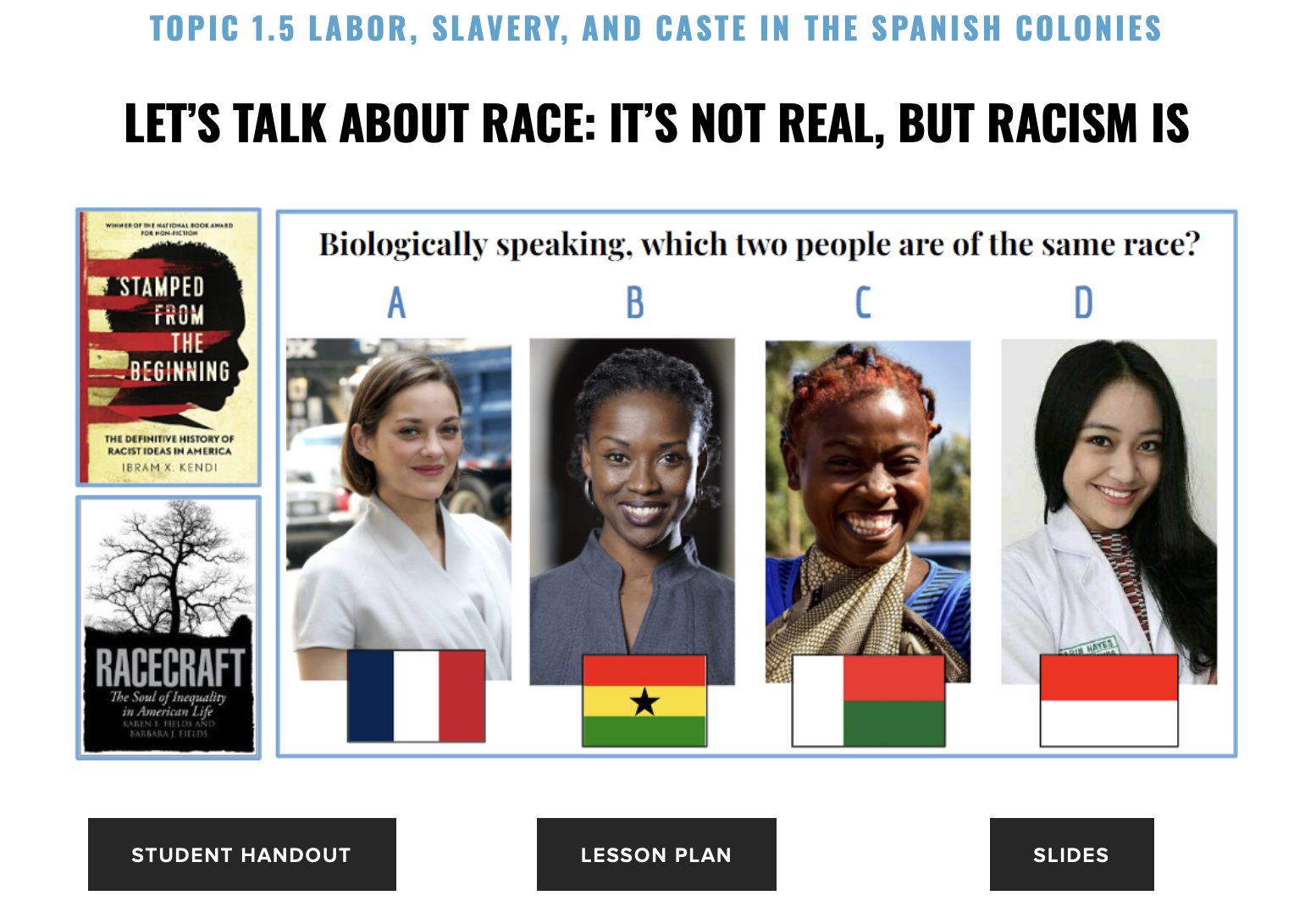 Let’s Talk about Race: It isn’t Real, but Racism is Lesson Plan and Materials "Objective: Students will begin the process of “unlearning” the deeply ingrained societal myth that race is a biological reality by tracing the origins of the invention of ‘race.'